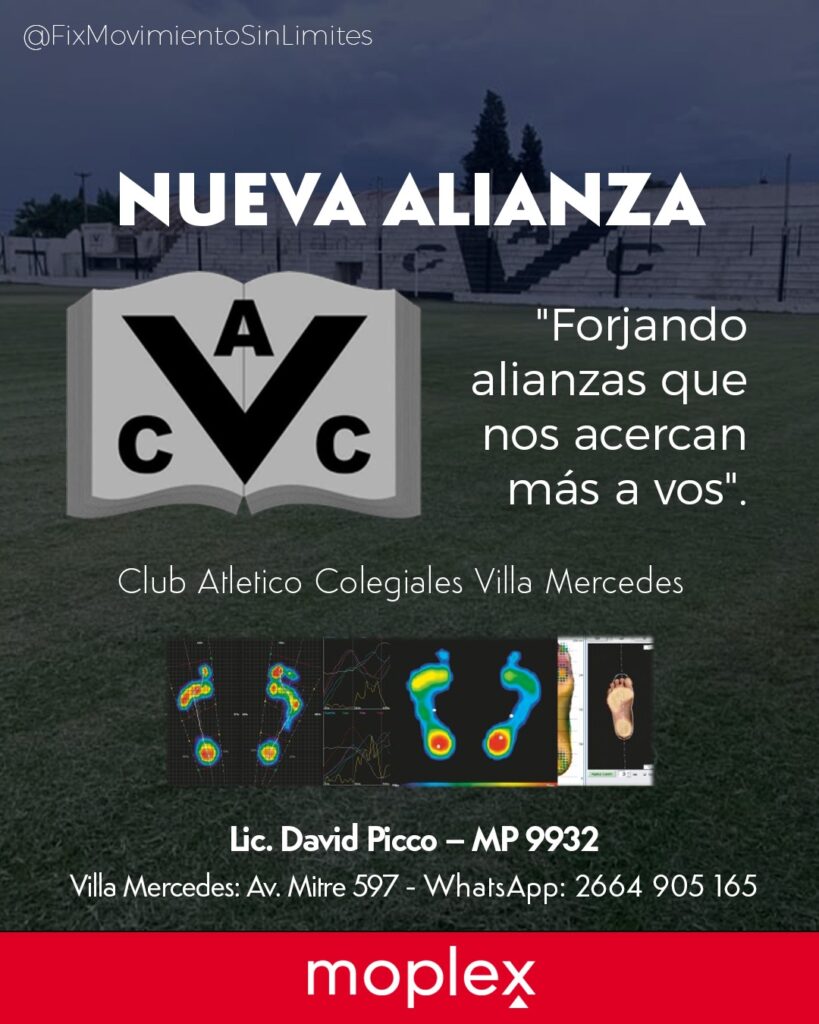 El Club Atlético Colegiales Villa Mercedes avanza en su compromiso con el bienestar de sus deportistas y socios al firmar, el pasado 9 de diciembre, un importante convenio de colaboración con Moplex, representado por el Licenciado David Pico, especialista en kinesiología y fisioterapia (MP 9932).